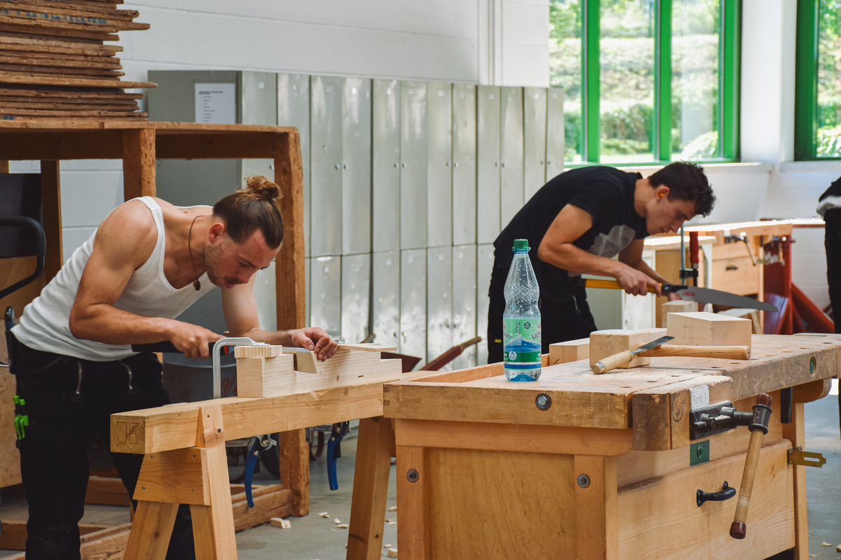 - Zimmerer/-innen beeindruckten mit der Erstellung eines gleichgeneigten Krüppelwalmmodells.