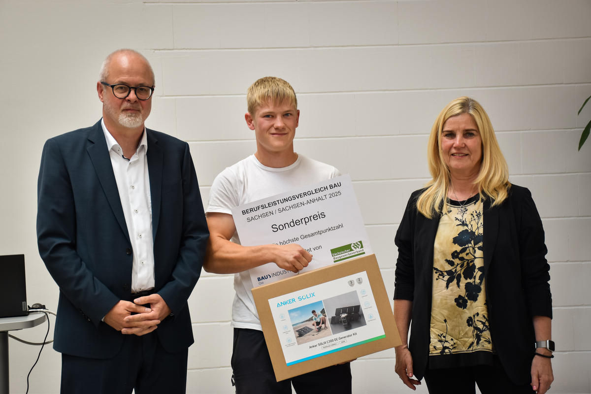 Zusätzlich wurde der Preis für den besten Auszubildenden des gesamten Wettbewerbs gemeinsam vom Bauindustrieverband Ost e. V. und dem Sächsischen Baugewerbeverband e. V. gestiftet. Dabei handelte es sich um eine Powerstation mit Solarpanel von ANKER im Wert von 400 Euro. Finn Kuske erzielte im Beton- und Stahlbetonbau die höchste Gesamtpunktzahl aller Teilnehmenden und sicherte sich damit den Sonderpreis.