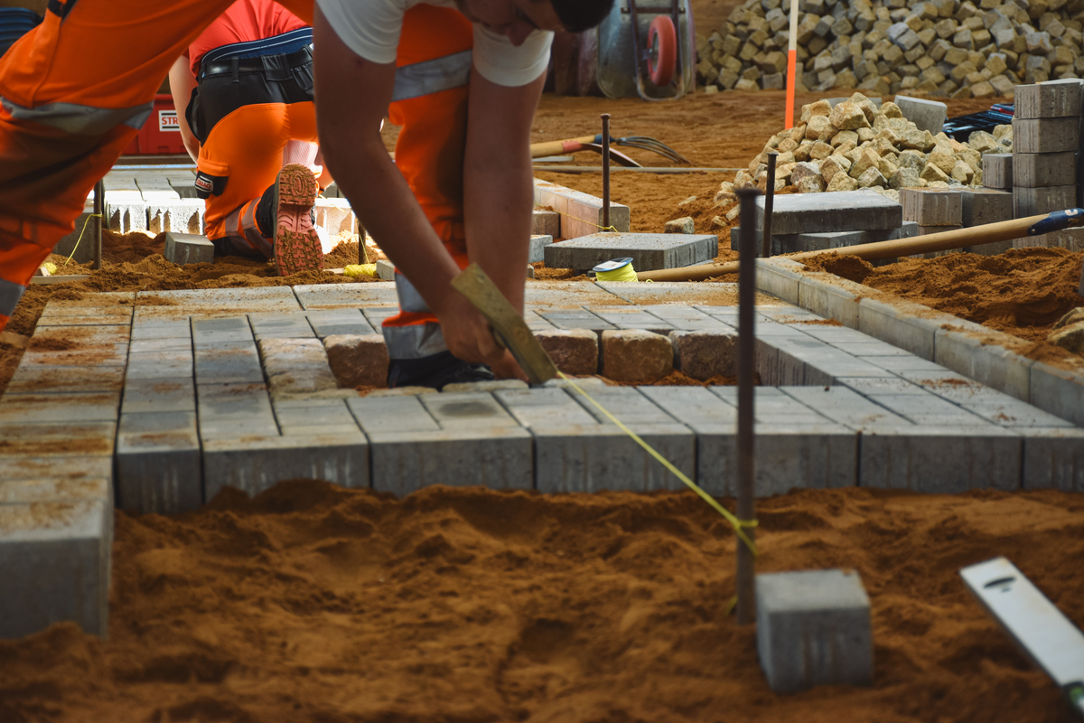 - Straßenbauer/-innen bewiesen ihr Können beim Pflastern einer komplexen Fläche mit verschiedenen Natur- und Kunststeinen.